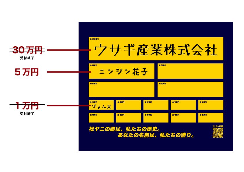 お名前は、ご寄付額に応じたスペース(大・中・小)に、ご指名いただいた選手が手書きで記入いたします。